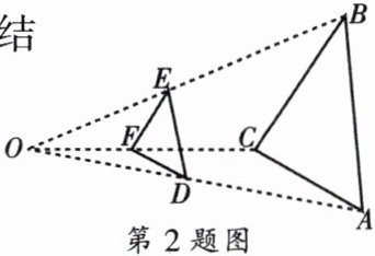 2. 如图,按如下方法,将$\triangle ABC的三边缩小到原来的\frac {1}{2}$,任取一点O,联结AO、BO、CO,并取它们的中点D、E、F,得$\triangle DEF$,则下列说法正确的是(