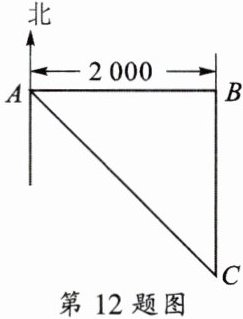 12. 如图,东、西两炮台A、B相距2000m,同时发现入侵敌舰C,炮台A测得敌舰C在它的南偏东$45^{\circ }$的方向,炮台B测得敌舰C在它的正南方,试求敌舰与两炮台的距离.($\sqrt {2}\approx $1.414,精确到1m)