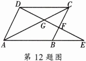 12. 如图,已知四边形$ABCD$是平行四边形,$E是AB$延长线上一点,$DE分别交对角线AC于点G$,边$BC于点F$.