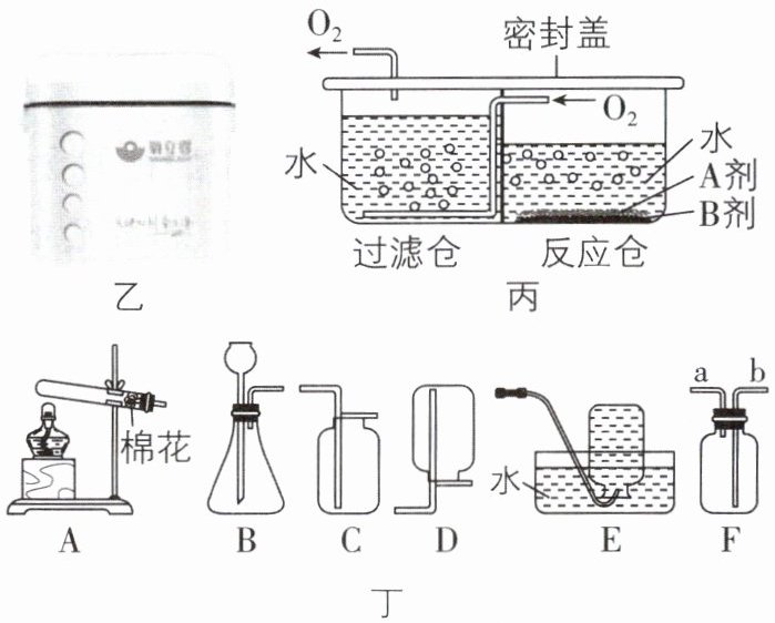 (5)还有一种为化学制氧器“氧立得”,如图乙,工作原理如图丙,将过碳酸钠和二氧化锰加入反应仓的水中,发生两个反应:过碳酸钠遇水后可缓慢分解为碳酸钠和过氧化氢;生成的$H_{2}O_{2}$继续分解产生氧气。A剂为过碳酸钠,B剂为二氧化锰。