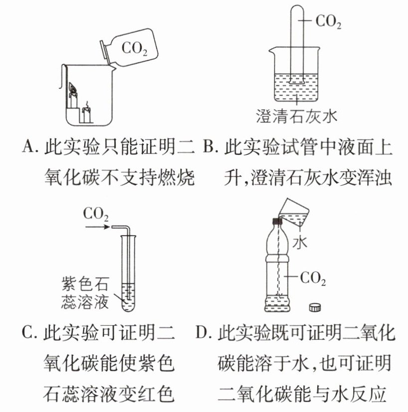 2.B 【解析】A 此实验除了可以证明二氧化碳不燃烧也不支持燃烧,还可以证明二氧化碳的密度比空气大,A错误 B 澄清石灰水变浑浊是因为二氧化碳与澄清石灰水反应生成碳酸钙沉淀和水,二氧化碳被消耗,所以试管中液面上升,B正确 C 实验中观察到紫色石蕊溶液变红色,是因为二氧化碳与水反应生成碳酸,碳酸使紫色石蕊溶液变红色,C错误 D 此实验只能证明二氧化碳能溶于水,不能证明二氧化碳能与水反应,D错误