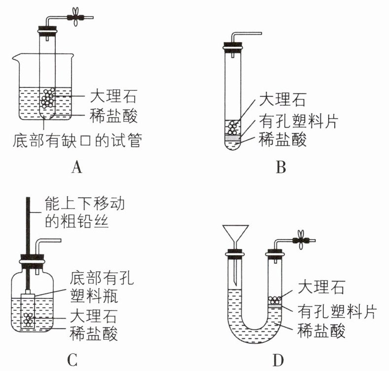 B 大理石与稀盐酸反应生成二氧化碳气体,虽然有带孔的塑料片,但是装置中没有弹簧夹,大理石一直浸没在稀盐酸中,装置无法控制反应发生和停止,B符合题意