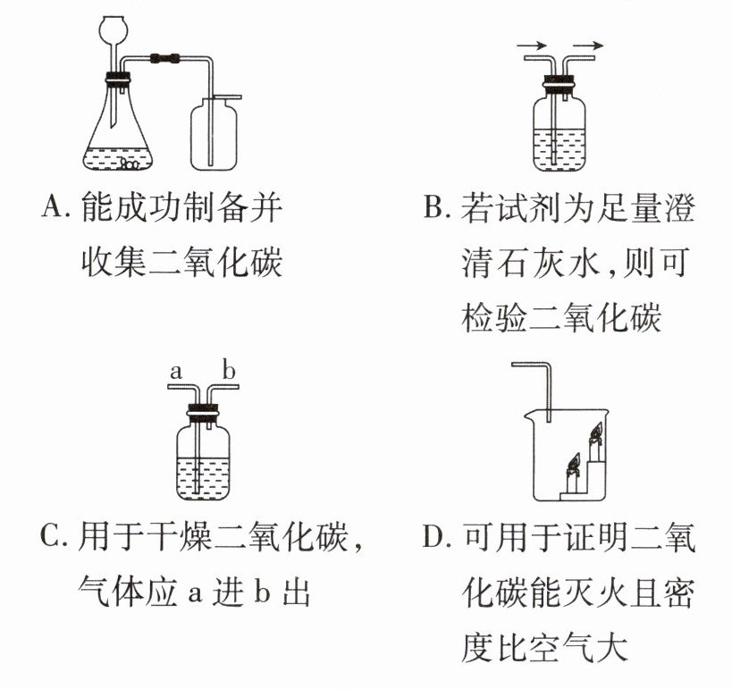 A 【解析】实验室制取二氧化碳时,长颈漏斗下端应该伸入液面以下,防止二氧化碳从长颈漏斗逸出,故A错误;澄清石灰水可用于检验二氧化碳气体,故B正确;干燥气体时,气体应该“长进短出”,故C正确;烧杯中下层的蜡烛先熄灭,上层的蜡烛后熄灭,该实验可用于证明二氧化碳能灭火,且密度比空气大,故D正确。