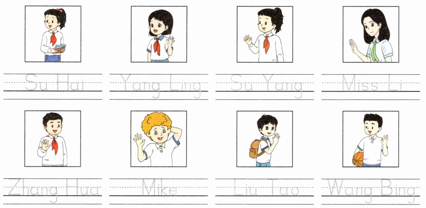 【解析】:这是一道英语看图描一描的题目,考查对人物英文名字的识别和书写能力。解题关键在于仔细观察图片中的人物形象,然后准确写出对应的英文名字。