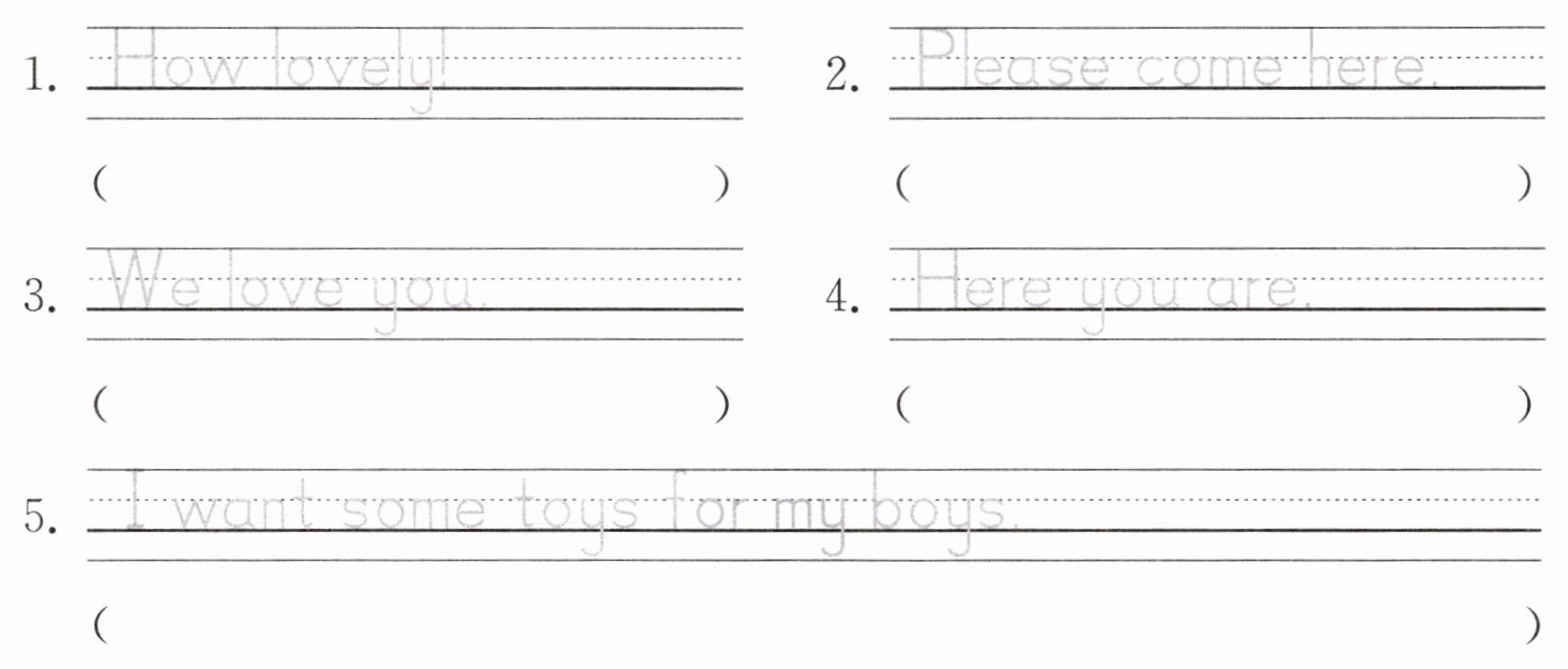描写略 1. 真可爱! 2. 请到这里。 3. 我们爱你。 4. 给你。 5. 我想要一些玩具给我的男孩们。