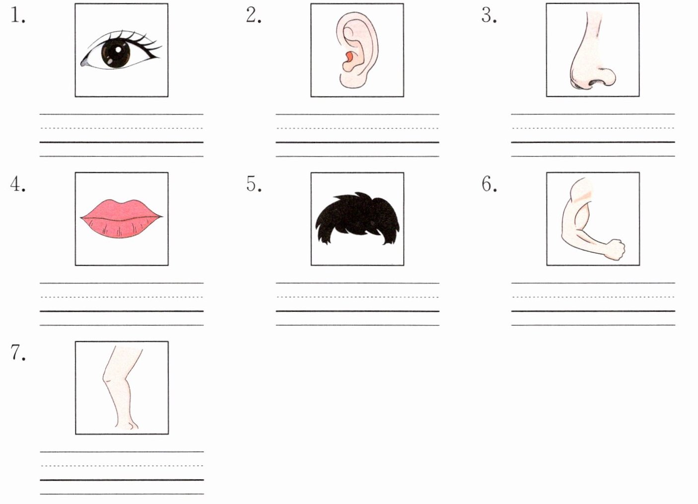 1. eye 2. ear 3. nose 4. mouth 5. hair 6. arm 7. leg