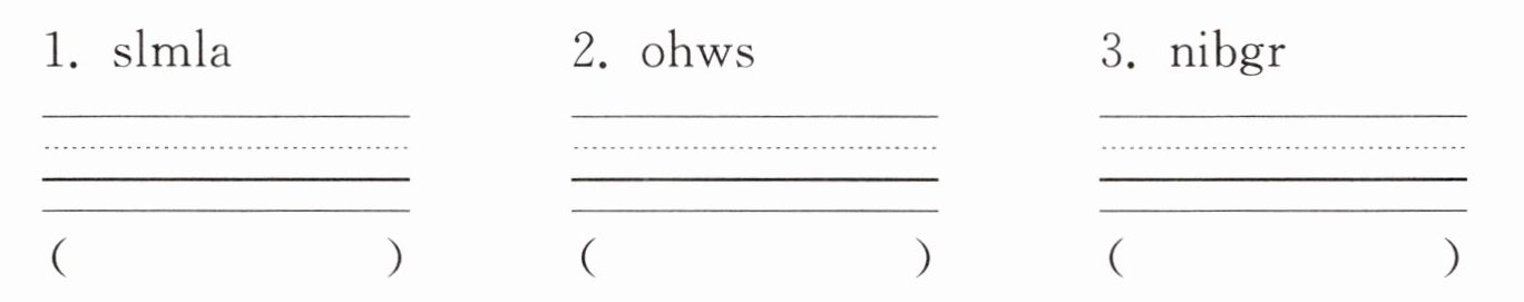 一、将下列字母组成单词写在四线三格内,并翻译成中文。