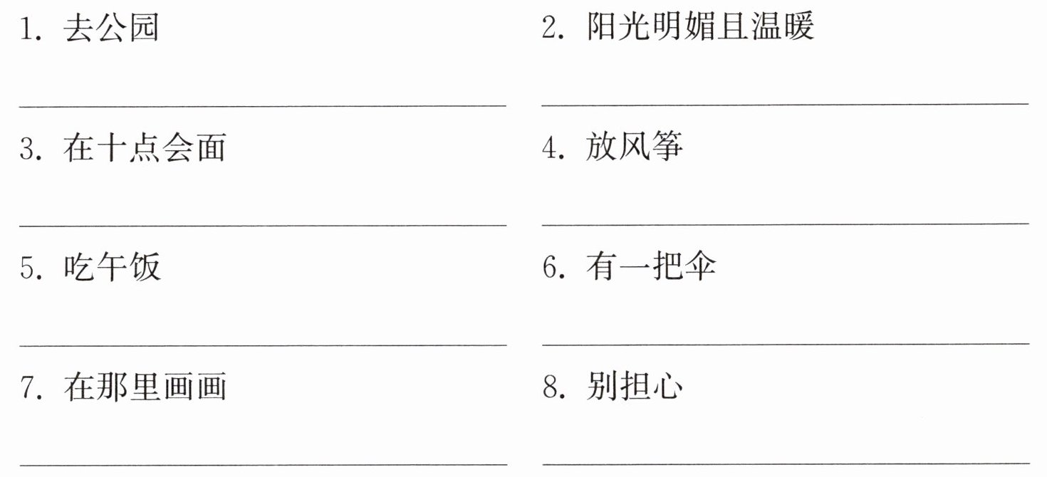 1. go to the park 2. sunny and warm 3. meet at ten 4. fly a kite 5. have lunch 6. have an umbrella 7. draw pictures there 8. don't worry