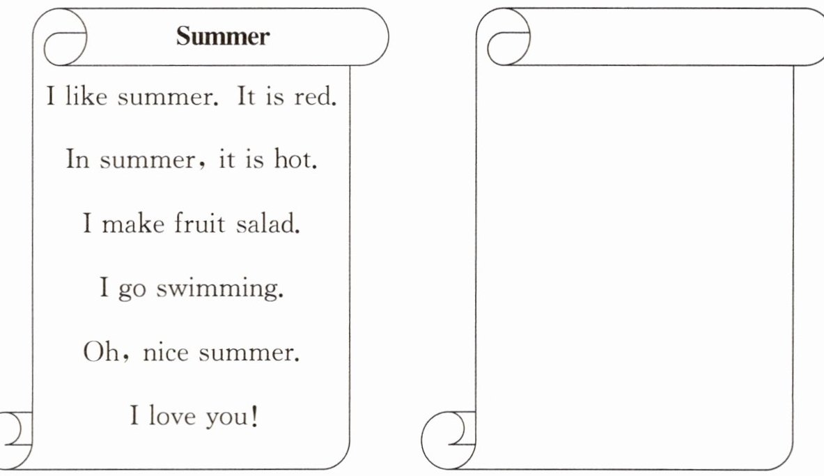 One possible version: Spring I like spring. It is green. In spring, it is warm. I plant trees. I go boating. Oh, nice spring. I love you!