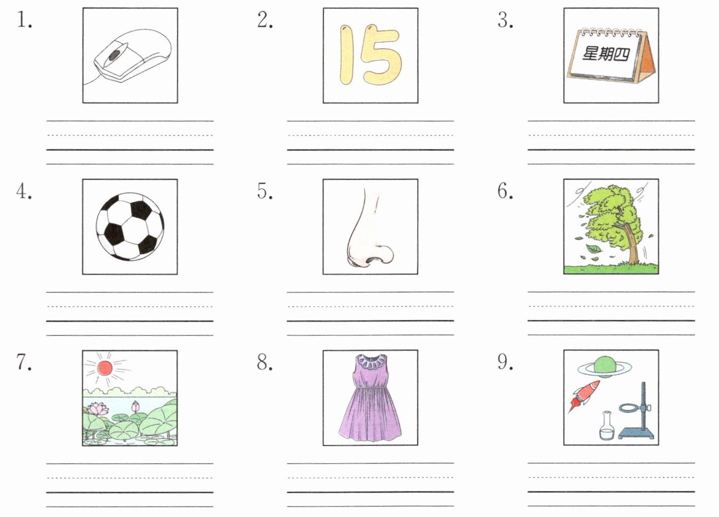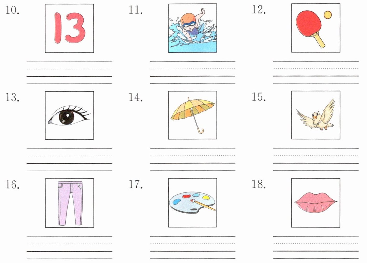 二、1. mouse 2. fifteen 3. Thursday 4. football 5. nose 6. windy 7. summer 8. dress 9. Science 10. thirteen 11. swimming 12. ping-pong 13. eye 14. umbrella 15. bird 16. trousers 17. Art 18. mouth