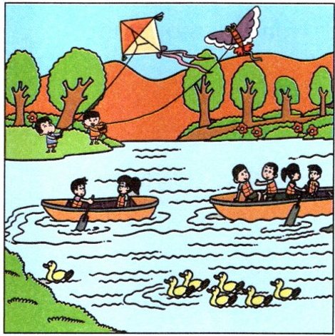 1. There is a hill in the park. 2. There is a river in the park. 3. There are some flowers near the river. 4. There are two boats on the river. 5. There are two kites in the sky.(本大题答案不唯一)