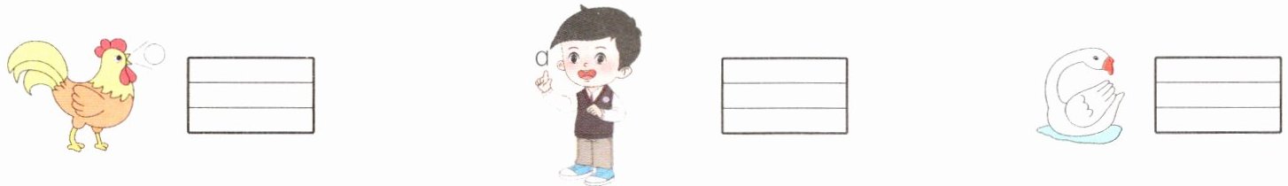 o a e 解析·图一,公鸡的叫声提示字母o;图二,小朋友的嘴型和手指上指的字母提示字母a;图三,鹅的姿势和“鹅”的读音提示字母e。在四线格里写字母时应注意:a两笔写成,占中格;0一笔写成,占中格;e一笔写成,占中格。