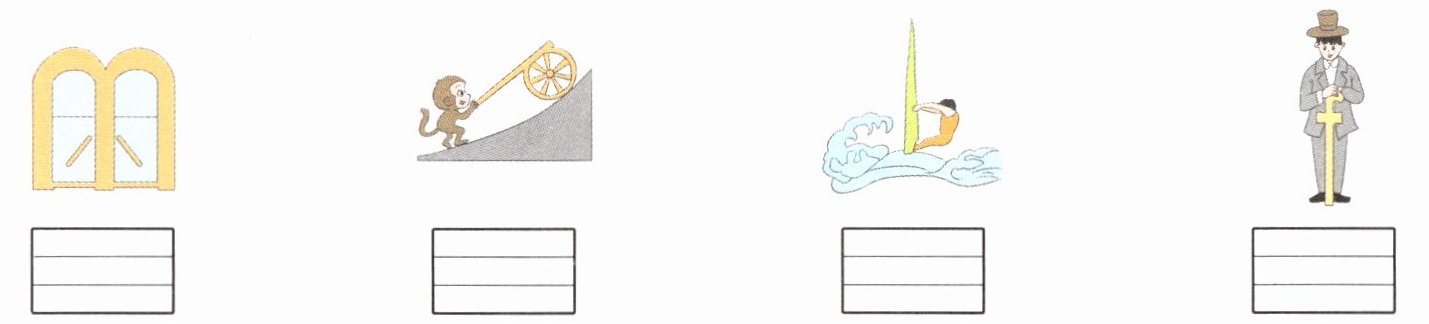 m p b f 解析·图一,门的形状提示字母m;图二,小猴推木板车上坡,木板车的形状和“坡”的读音提示字母p;图三,运动员驾着帆船在海上冲浪,运动员的身姿和帆船的桅杆构成的图形提示字母b;图四,一位绅士拿着手杖,手杖的形状提示字母f。在四线格里写字母时应注意:m三笔写成,占中格;p两笔写成,占中格和下格;b两笔写成,占上格和中格;f两笔写成,占上格和中格。