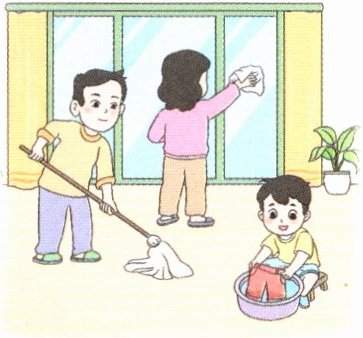 tuō dì cā bō li xǐ kù zi 解析·观察图片可知,爸爸在拖地,妈妈在擦玻璃,“我”在洗裤子,据此把句子补充完整即可。