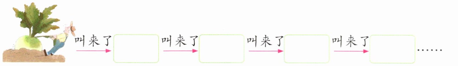 ③ ① ④ ② 解析·读完《拔萝卜》这则故事,就知道先是老公公拔萝卜,后来又叫来了老婆婆、小姑娘、小狗、小猫……来帮忙一起拔。