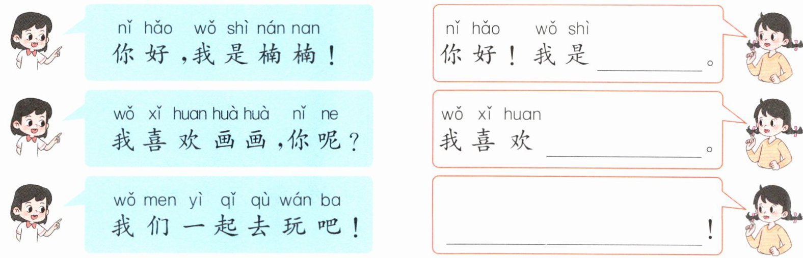 六、【游戏六:我们一起交朋友】口语交际:我们该如何跟别人交朋友呢?读一读下列对话,填一填。