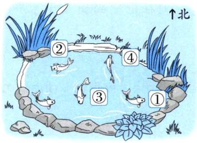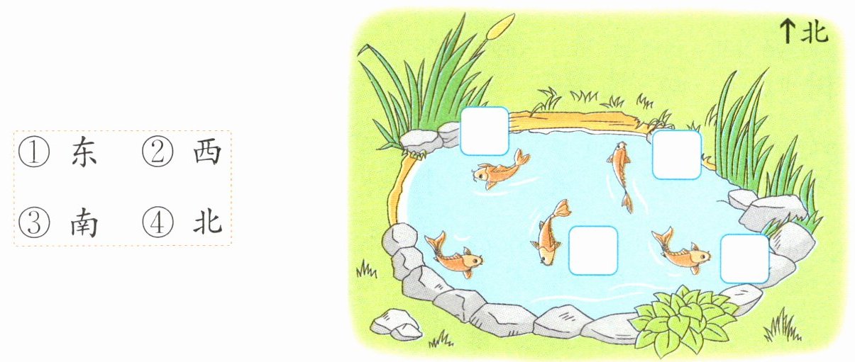 四、【头雁带我们找方向】照样子,标一标鱼儿游的方