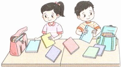 示例:1. 放进书包里 2. 文具 文具盒里 解析·先观察图片,再补充句子。第1题的图片中,两个小朋友正在把书本放进书包里;第2题的图片中,小朋友正在把文具放进文具盒里。据此补充句子即可。