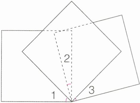 2. 三个正方形如下图所示摆放,已知 $ ∠1 = 45° $,$ ∠3 = 30° $,求 $ ∠2 $ 的度数。