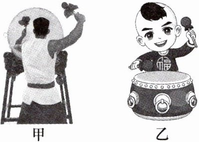 6. 如图所示,甲鼓发声时鼓皮每秒振动的次数比乙的少,甲、乙相比,甲鼓皮(