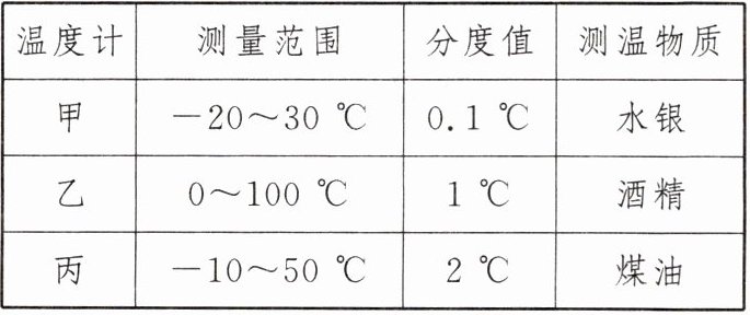 9. 北京五中校本经典题 研究电冰箱内的温度分布情况,需要将几支温度计分别放在冰箱内多个位置,几分钟后,记录各测量点的温度。为了顺利完成这项研究,表中提供的三种规格的温度计应选用