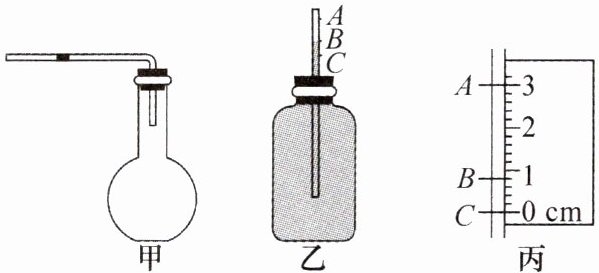 (填“$A$”或“$C$”)。再用该温度计测室内温度,液柱正好移动到$B$处,接着将刻度尺的零刻度线对准$C$,则$A$、$B$在刻度尺中的位置如图丙所示,那么此时室温为18