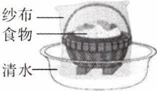 1. 如图所示,盛一盆水,在盆里放两块高出水面的砖头,砖头上搁一只比盆小一点的篮子。篮子里有剩饭、剩菜,再把一个纱布袋罩在篮子上,纱布袋口的边缘要浸入水里,这样就做成了一个简易冰箱。这是利用水在