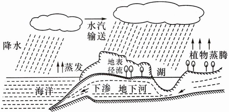 6. (双选)(2023·十堰)地球表面 70%以上是海洋,可供人类直接利用的淡水资源不足全部水资源的万分之一,提高节水意识是公民的义务和责任。如图是水循环示意图,下列说法正确的是(