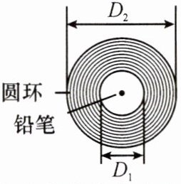 3. 一条纸带厚薄均匀,若把纸带紧密地环绕在圆柱形铅笔上,恰好能套进一个圆环内。如图所示,纸带在铅笔上环绕了$n$圈,则纸带厚度是(用$D_{1}$、$D_{2}$和$n$的表达式表示)。若实验时纸带没有紧密地环绕在铅笔上,会使测量值(填“偏大”“偏小”或“不变”)。