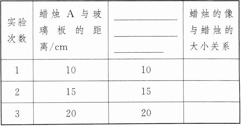 (4)分析实验数据得出,蜡烛 A 的像和蜡烛 A 到玻璃板的距离