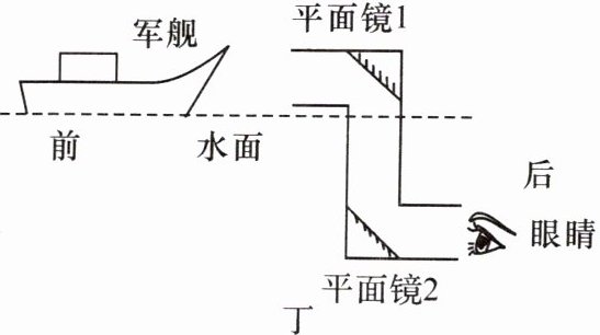 原理。如图丁,现有一艘军舰位于与平面镜 1 等高的正前方,则人眼看到军舰所成的虚像位于与平面镜2等高的正前方
