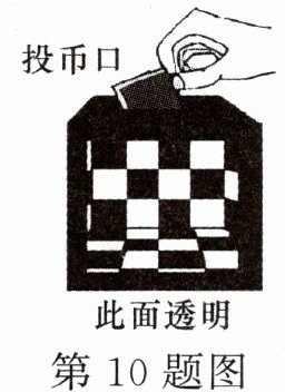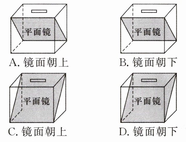 10. 小明在科技节中表演魔术:从投币口投入只有正面透明的棋盘格空箱的硬币消失了!随后他揭秘:这是平面镜和棋盘格共同形成的结果。下列放置平面镜的方式能实现这个魔术效果的是(