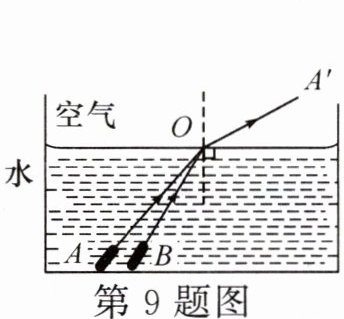 9. (2024·河南)如图,观光水池中,一束红光沿$AO$方向从水中射入空气,折射光线为$OA'$。若另一束红光沿$BO$方向从水中射入空气,请大致画出入射光线$BO$的折射光线,并标出对应的折射角$r$。