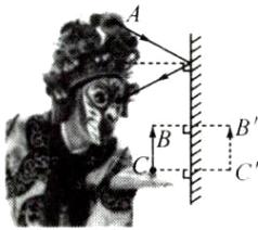 10. (2024·郑州中原区期末)京剧被列入我国第一批国家级非物质文化遗产名录。图中是演员通过平面镜看到头顶$A$点的一条光路,请在图中画出平面镜的位置,并画出手中的物体$BC$在平面镜中的像。