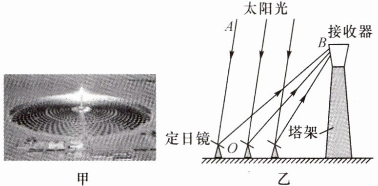 位于北京延庆的塔式太阳能热发电站,是由我国自主设计与建造的亚洲第一座兆瓦级规模的塔式太阳能热发电站,如图甲所示。塔式热发电系统的一项关键技术如图乙所示,发电站安装有许多定日镜(即平面镜),每一个定日镜都由自动跟踪太阳光装置控制,以便准确地将太阳光反射后会聚到高塔顶部的接收器上。