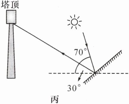 3. 如图丙所示,某塔式太阳能电站的一块平面镜在塔的东边,下午某时刻,从西向东的太阳光与水平方向成 $70^{\circ}$ 角射向这块平面镜,反射光线与水平方向成 $30^{\circ}$ 角,则反射角的度数是