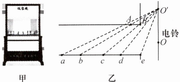 12. (2023·武汉)一块仪容镜如图甲所示,放在某学校走廊的AB处,仪容镜靠墙而立,镜面与墙壁平行,在另一面墙壁上的O处悬挂一个电铃,如图乙所示。小强同学沿着走廊的ae直线走动,若将人和电铃各自看作一个点,为了总能看到电铃通过仪容镜所成的像O',则小强同学所在的区间是(