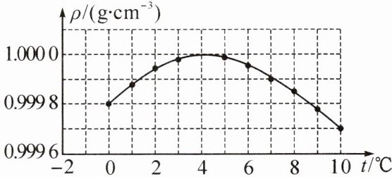 5. 如图所示为水的密度在$0\sim10^{\circ}C$范围内随温度变化的曲线。根据图像可知,在$0\sim4^{\circ}C$,水温升高时,水的体积将
