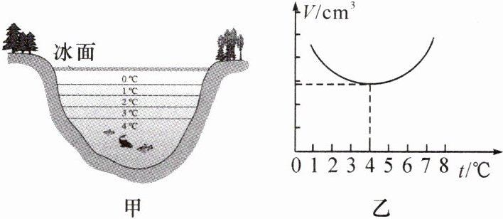 8. (双选)图甲为北方冬天湖水温度分布示意图,图乙为一定质量的水的体积在$0\sim8^{\circ}C$范围内随温度变化的图像,根据图像及水的其他性质,下列分析判断正确的是(