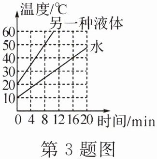 3. (2024·许昌长葛市期中)小丽用相同的电加热器分别对质量为0.2kg的水和0.3kg的另一种液体进行加热,得到实验数据如图所示,水在16min内吸收的热量为