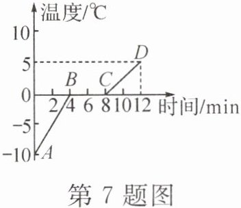 7. (2024·漯河郾城区期中)小明在探究冰熔化特点时,用酒精灯加热$50g$的冰,每$4min$完全燃烧的酒精质量均为$0.2g$,冰熔化过程中温度随时间变化的图像如图所示。由此可知:$0~4min$冰吸收的热量为
