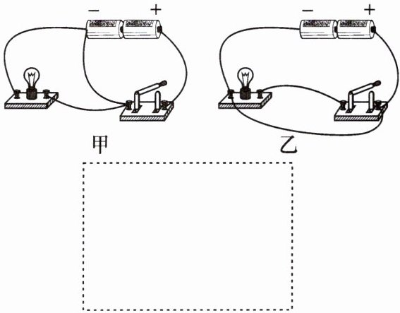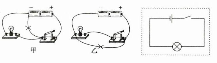 6. 【教材习题改编】如图,甲、乙电路中各有一根导线接错而使电源被短路,请把这根导线找出来,在上面画一个“×”,并在虚线框内画出正确的电路图。
