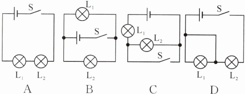 2. 如图所示的电路中,当开关 $ S $ 闭合时,灯泡 $ L_1 $、$ L_2 $ 并联的是(