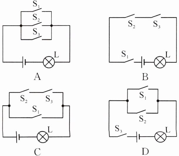 5. (2024·枣庄)常用智能手机是通过指纹开关 $ S_1 $ 或密码开关 $ S_2 $ 来解锁的, 若其中任何一种方式多次解锁失败, 锁定开关 $ S_3 $ 均会断开而暂停手机解锁功能, 开关 $ S_3 $ 将在一段时间后自动闭合而恢复解锁功能。若用灯泡 L 发光模拟手机解锁成功, 则图中符合要求的模拟电路是 (