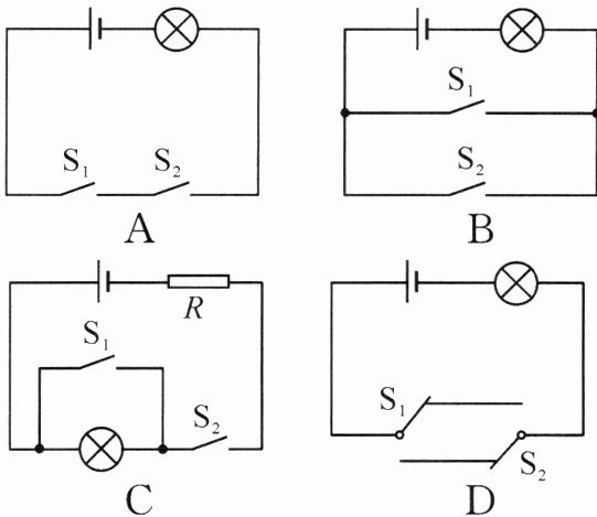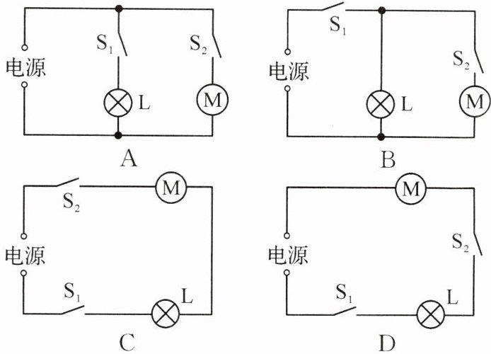 1. (2024·无锡)电冰箱冷藏室中的照明灯 L 由门控开关 $ S_1 $ 控制, 压缩机 (电动机) 由温控开关 $ S_2 $ 控制, 要求照明灯和压缩机既能单独工作又能同时工作, 下列电路中符合上述要求的是 (