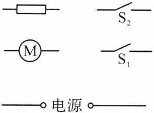 3. (2024·洛阳期末)电吹风的主要工作元件是发热丝 ( )、电风扇 ( ) 及开关。闭合开关 $ S_1 $, 电吹风吹出冷风; 若同时还闭合 $ S_2 $, 电吹风吹出热风; 若只闭合 $ S_2 $, 电吹风不吹风也不发热。请用笔画线代替导线, 完成电路设计。