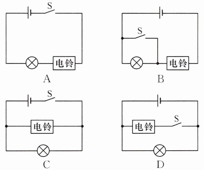 2. (2024·天津)某兴趣小组要为居家老人设计一个“应急呼叫器”电路, 要求: 开关断开时, 电灯和电铃均不工作; 开关闭合时, 灯亮铃响, 即使电灯因断路不亮, 电铃仍可工作。如图所示的电路中, 符合设计要求的是 (