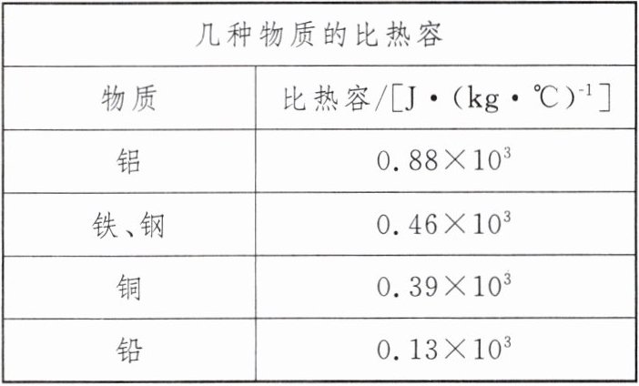 解:由 $ Q=cm\Delta t $ 可得,金属块的比热容:$ c=\frac{Q}{m\Delta t}=\frac{6.6× 10^{4}\ J}{1.5\ kg× 50\ ^{\circ}C}=0.88× 10^{3}\ J/(kg\cdot^{\circ}C) $根据表格的信息可知,该金属可能是铝。
