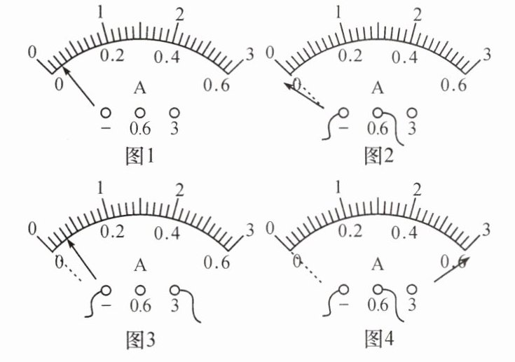 11. 甲、乙、丙、丁四名同学在做“用电流表测电流”的实验,甲在连接电路前发现电流表指针偏转情况如图1所示;乙、丙、丁闭合开关前,他们的电流表指针均指在零刻度线处,当闭合开关试触时,发现电流表指针摆动分别出现了如图2、3、4所示的三种情况。