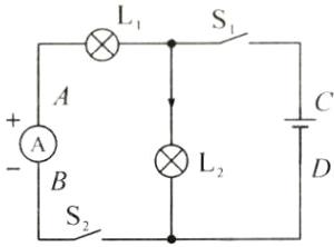 13. 如图所示,根据开关都闭合后电路图中标出的电流方向,在图中的AB和CD间分别填上电池或电流表的符号,并标出电流表的“+”和“-”。要求:①使电路中实际的电流方向和图中所标出的方向一致;②符合电流表的使用要求。